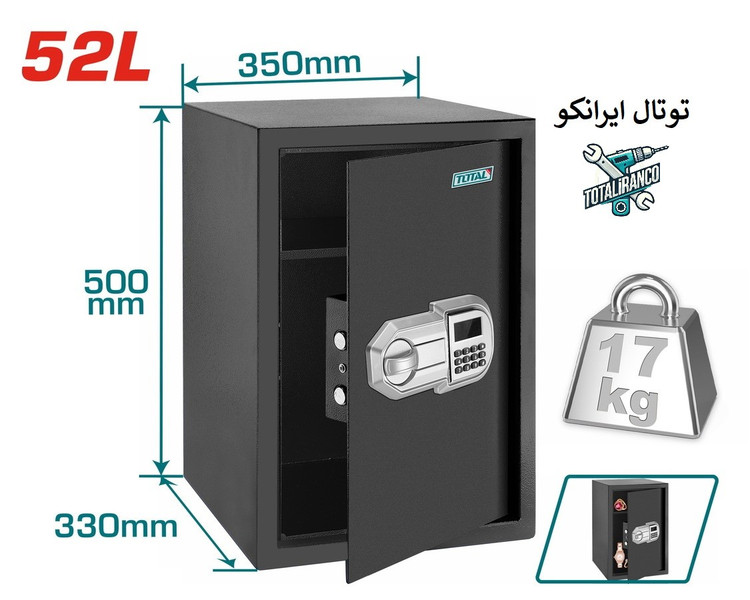 ۱ عدد گاوصندوق، ۲ عدد کلید مکانیکی، ۱ عدد دفترچه راهنما/دستورالعمل نصب، ۴ عدد پیچ انبساطی