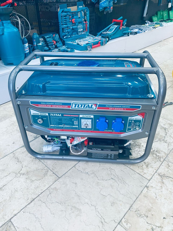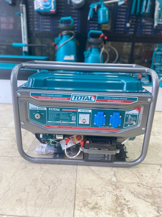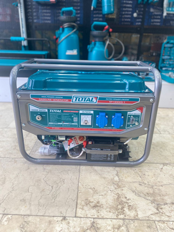 موتور برق توتال TP130005-1، موتور برق 3000 وات با 2 عدد پورت خروجی 230 ولت AC با آمپر 13 ولت می باشد. موتور برق TP130005-1 توتال، موتور برق بنزینی 3000 وات برای راه اندازی لوازم برقی منزل، مانند: یخچال، لباسشویی، کولر، تلویزیون، پمپ آب خانگی مناسب می باشد